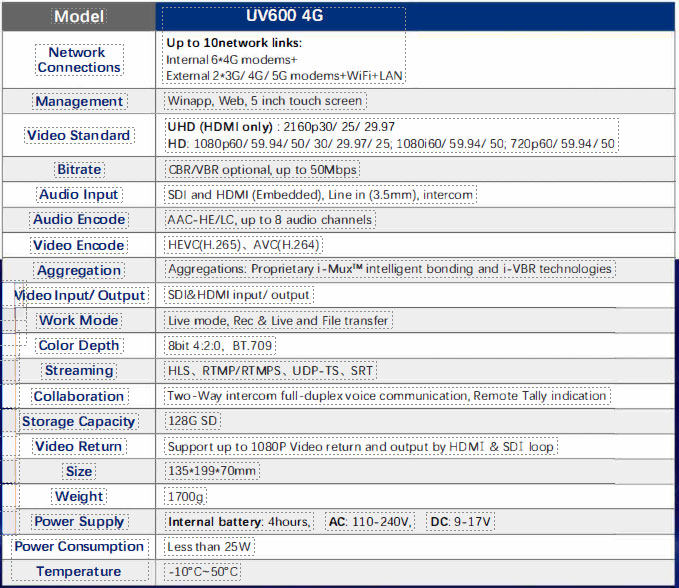 UV600 เป็นอุปกรณ์สตรีมมิ่งสดมือถือคุณภาพสูงที่รองรับการสื่อสารมือถือ 4G อย่างเต็มรูปแบบ และให้ประสบการณ์การส่งสัญญาณและคุณภาพรูปภาพที่ดีขึ้นให้กับผู้ใช้ผ่านเทคโนโลยี i-Mux การแบ่งและส่งข้อมูลอย่างฉลาดและเทคโนโลยีการส่งผ่านหลายทาง มีการใช้งานพร้อมกันมาก ล่าช้าต่ำและคุณสมบัติเทคโนโลยี 4G อื่น ๆ และเทคโนโลยีการเข้ารหัสอัจฉริยะ ใช้งานได้เหมาะสำหรับโครงสร้างสื่อมวลชน นักประจาตรัฐศาสตร์และไฟล์โปรแกรมอื่น ๆ ที่ต้องการการส่งข้อมูลอย่างมีประสิทธิภาพ