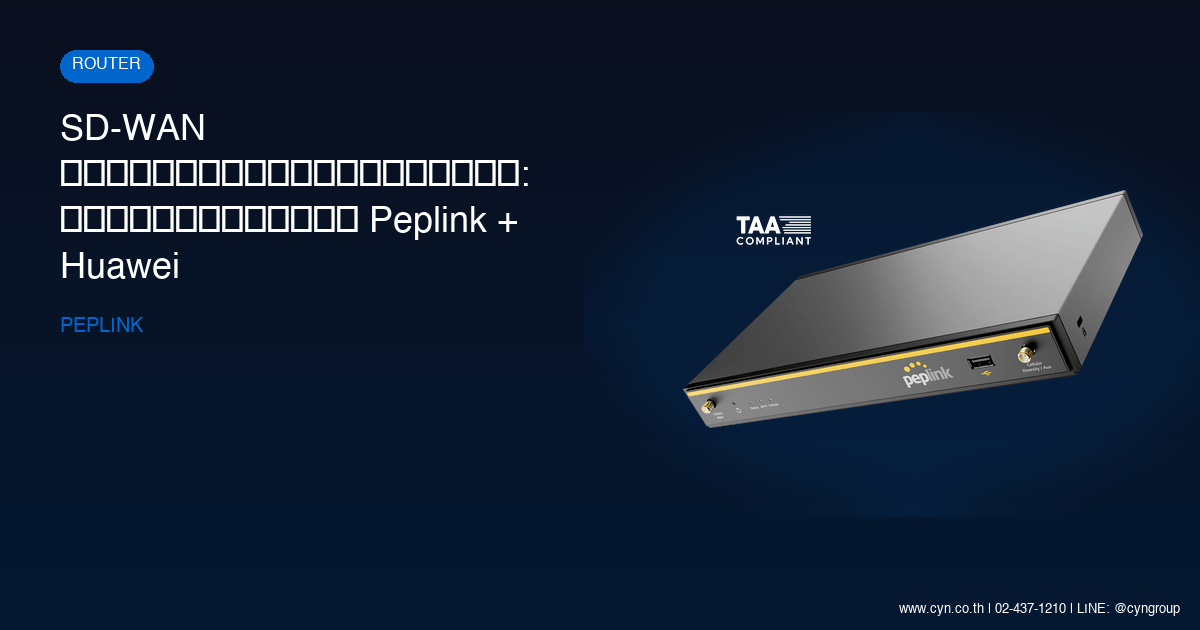 การลงทุนใน SD-WAN สำหรับธุรกิจหลายสาขาด้วยโซลูชัน Peplink และ Huawei คือการการันตีความมั่นคง รวดเร็ว และยืดหยุ่นให้กับเครือข่ายขององค์กรในยุคดิจิทัล โซลูชันนี้ช่วยแก้ปัญหาความล่าช้าและการเชื่อมต่อที่ขาดหาย เป็นกุญแจสำคัญที่จะขับเคลื่อนธุรกิจให้เติบโตได้อย่างต่อเนื่องและปลอดภัย หากธุรกิจของคุณต้องการระบบเครือข่ายที่สมบูรณ์แบบพร้อมคำปรึกษาจากผู้เชี่ยวชาญและสินค้าคุณภาพสูง อย่าลังเลที่จะติดต่อ CYN Communication เพื่อรับบริการคำปรึกษาและการสั่งซื้อสินค้าที่ตอบโจทย์ธุรกิจของคุณที่สุด