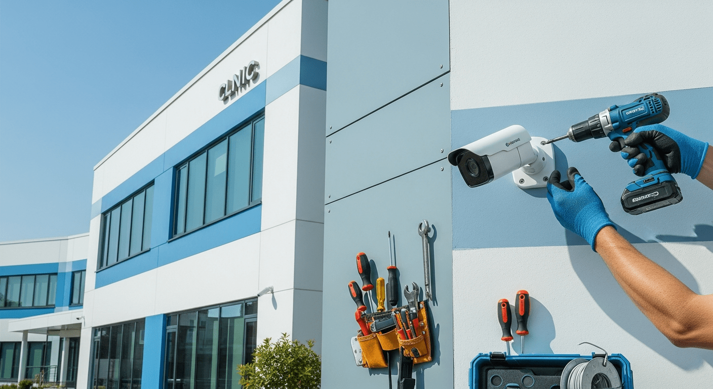– DAHUA DH-HAC-B2A21P-U-IL-A-2.8MM Bullet Camera installed on clinic wall with dual light and secure mounting bracket