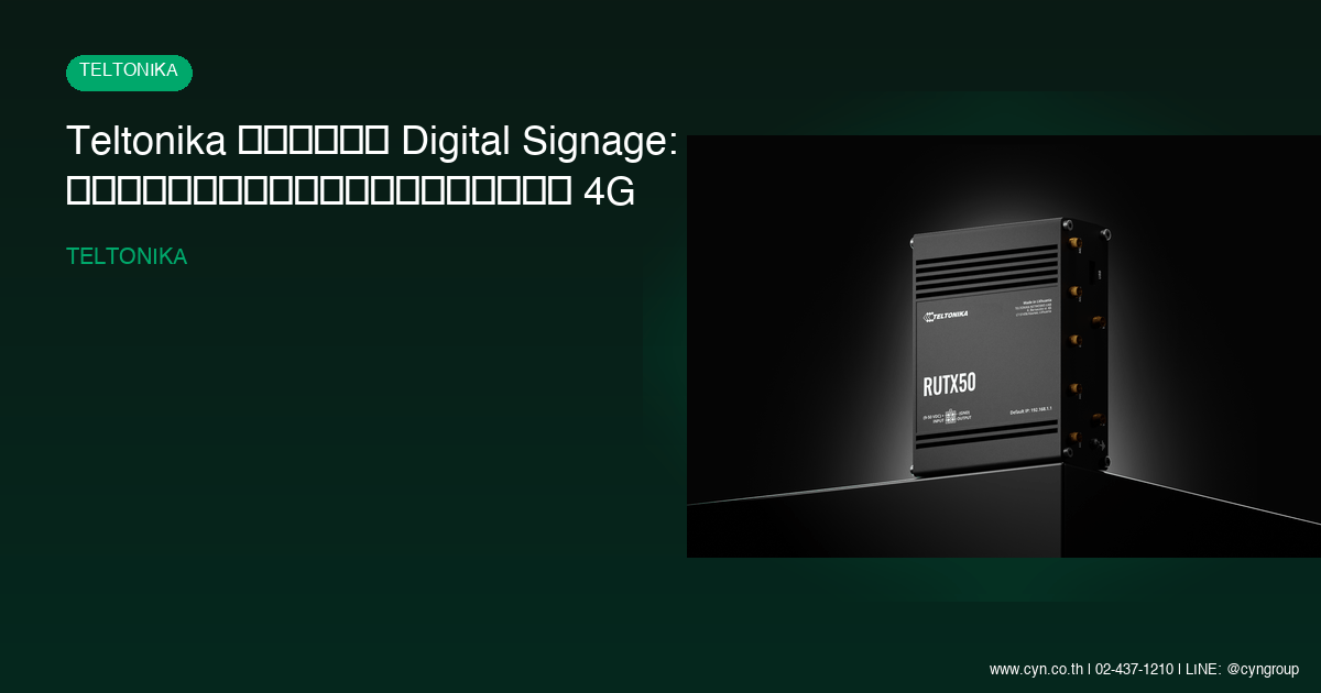การเชื่อมต่อจอโฆษณาผ่าน 4G ด้วยอุปกรณ์จาก Teltonika คือการลงทุนเพื่อความมั่นใจในระบบ Digital Signage ของคุณที่ไร้ข้อจำกัดด้านสถานที่และโครงสร้างพื้นฐาน ด้วยความเสถียร ความทนทาน และความสามารถในการจัดการระยะไกลที่เหนือกว่า ทำให้ธุรกิจของคุณสามารถส่งมอบประสบการณ์การโฆษณาที่ต่อเนื่องและน่าเชื่อถือได้ทุกที่ทุกเวลา อย่าปล่อยให้ปัญหาการเชื่อมต่อมาทำลายโอกาสทางธุรกิจของคุณอีกต่อไป ติดต่อ CYN Communication เพื่อรับคำปรึกษาจากผู้เชี่ยวชาญและสั่งซื้ออุปกรณ์ 4G Router จาก Teltonika รุ่น RUT241 และ RUTX11 ได้ทันที เพื่อเปลี่ยนระบบโฆษณาของคุณให้ทันสมัยและพร้อมรับทุกความท้าทาย
