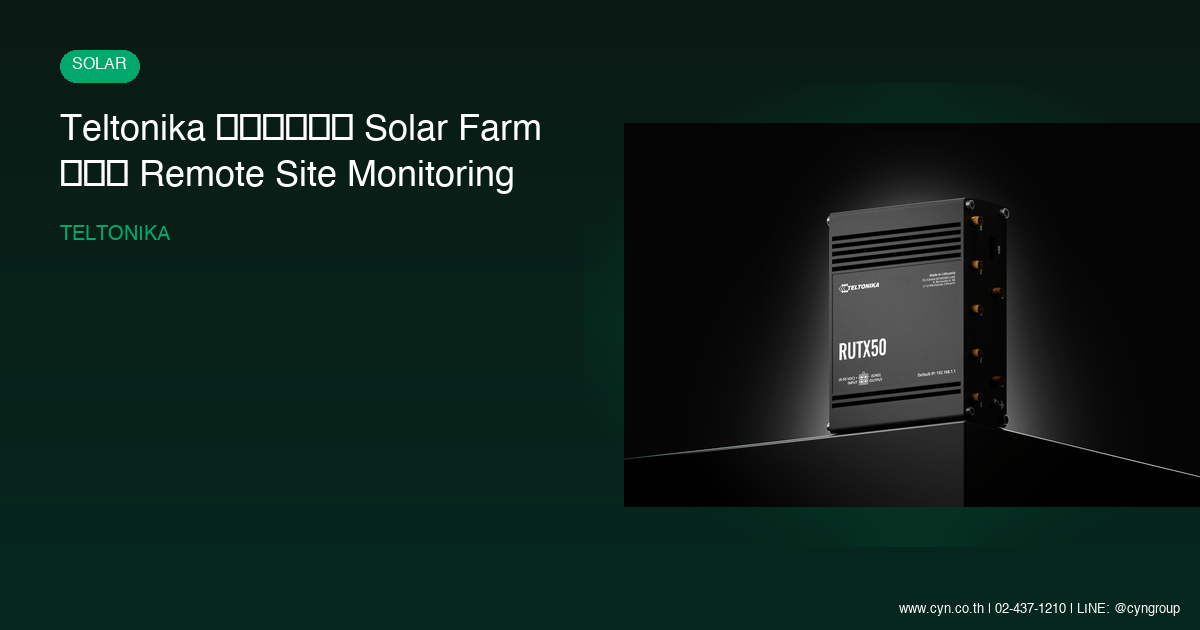 การเลือกใช้ระบบ Teltonika สำหรับ Solar Farm และ Remote Site Monitoring คือการลงทุนที่คุ้มค่าเพื่อสร้างความมั่นใจในประสิทธิภาพและความต่อเนื่องของระบบพลังงานหมุนเวียน ด้วยความสามารถในการรองรับ 5G/4G การจัดการพลังงานอัจฉริยะ และการรองรับโปรโตคอล SNMP ที่ครบครัน ทำให้ Teltonika กลายเป็นมาตรฐานใหม่สำหรับงานตรวจสอบระยะไกลในยุคปัจจุบัน เพื่อให้มั่นใจว่าฟาร์มพลังงานแสงอาทิตย์ของคุณจะทำงานได้อย่างเต็มศักยภาพและปลอดภัยที่สุด อย่าปล่อยให้ระบบของคุณหยุดชะงักจากการเชื่อมต่อที่ไม่เสถียร ติดต่อ CYN Communication ได้ทันทีเพื่อรับคำปรึกษาจากผู้เชี่ยวชาญและสั่งซื้อสินค้าจากตัวแทนจำหน่ายอย่างเป็นทางการในประเทศไทย เพื่อโซลูชันที่ดีที่สุดสำหรับธุรกิจของคุณ
